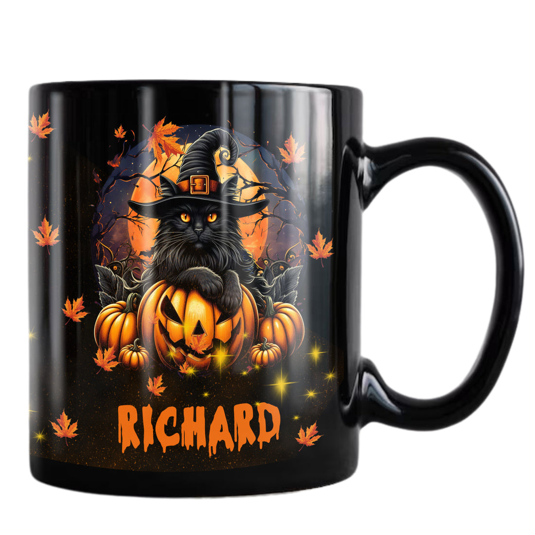 Personalized Halloween Black Cat Coffee Mug Custom Name Cats Ceramic Cup 11Oz 15Oz Decor Gifts for Kids Friends Women Men Family Holiday