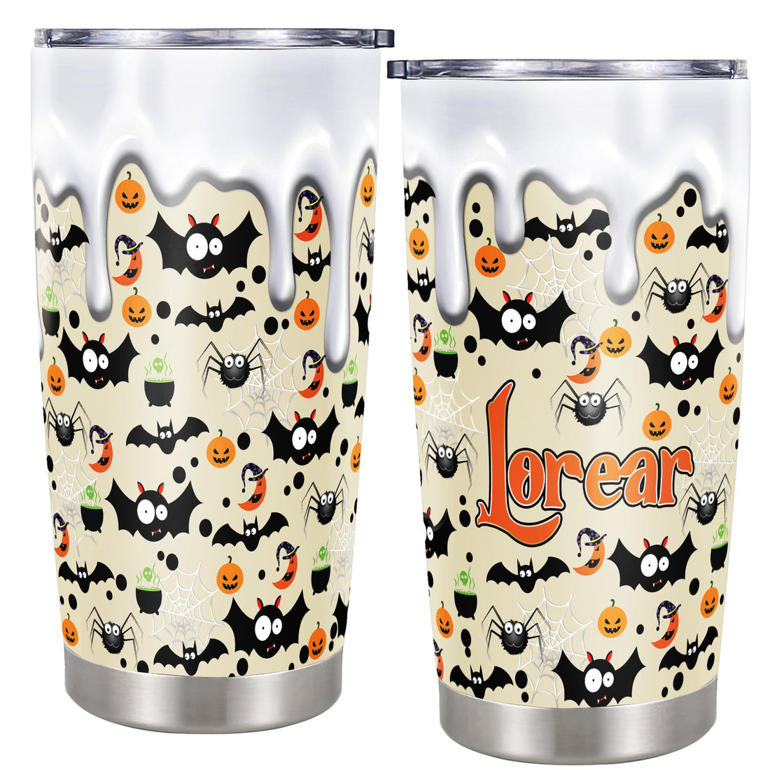Personalized Bat Halloween Pattern Tumbler Custom Name Travel Mug Coffee Insulated Cup with Lid Stainless Steel 20Oz 30Oz Decor Gifts for Women Men Kids