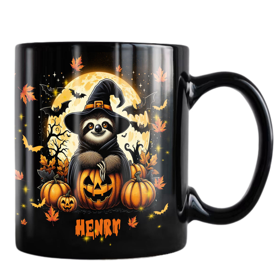 Personalized Halloween Sloth Coffee Mug Custom Name Ceramic Cup 11Oz 15Oz Decor Gifts for Kids Friends Women Men Family Holiday