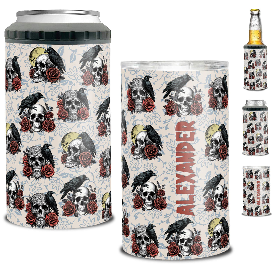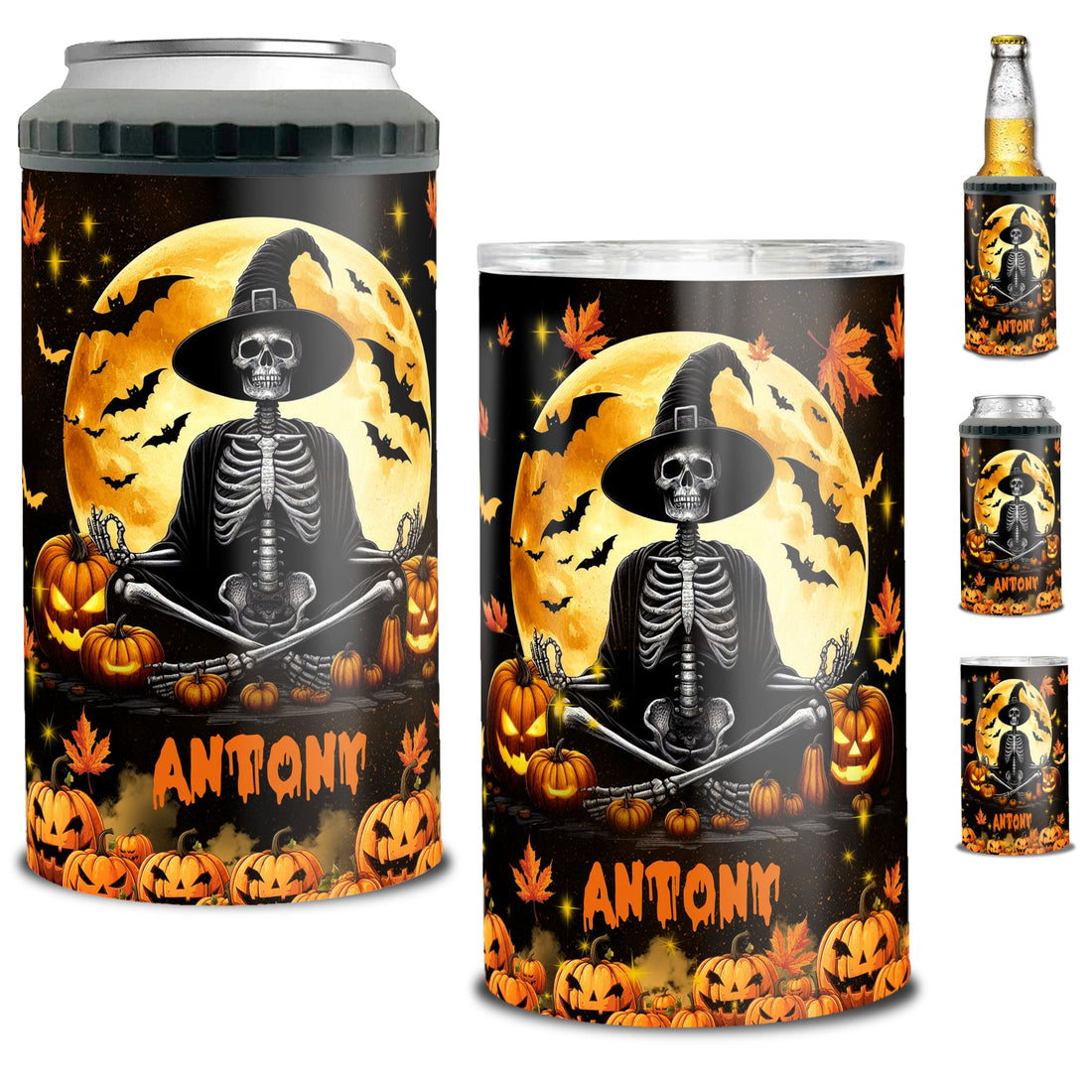 Personalized Skeleton Halloween Can Cooler 4 in 1 Holder Cup with Lids Customized Name 16oz Beer Drinking Gifts for Skeletons Lovers Women Men Kids Teen Holiday
