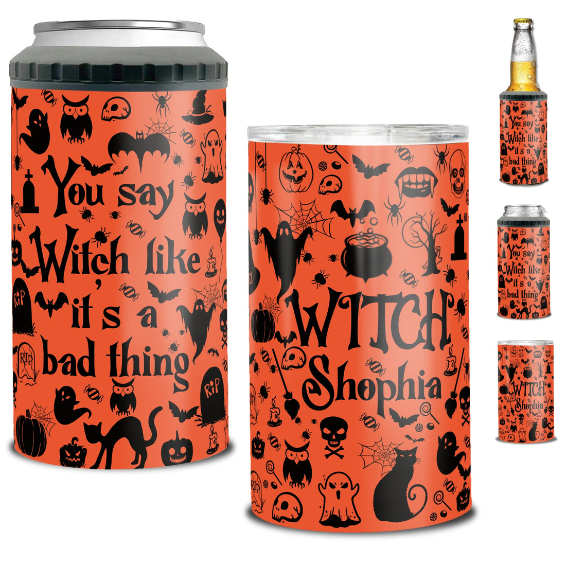 Personalized Halloween Witch Can Cooler 4 in 1 Holder Cup with Lids Customized Name 16oz Beer Drinking Gifts for Witches Lovers Women Men Kids Teen Holiday