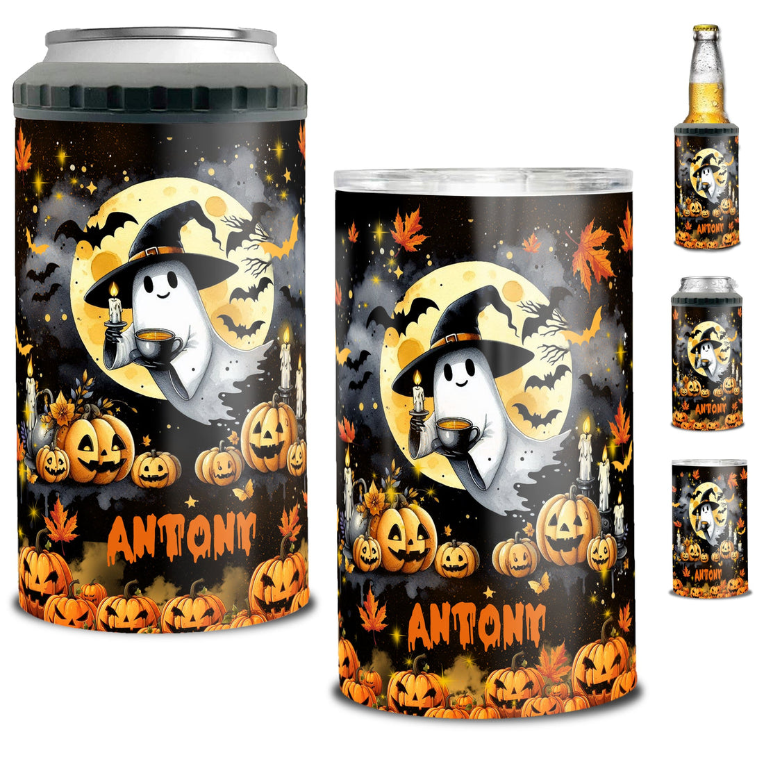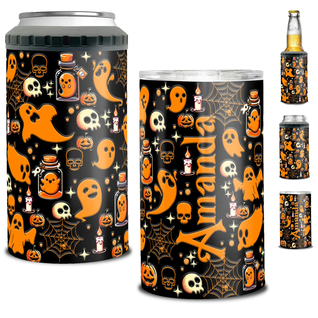 Personalized Cute Ghost Halloween Can Cooler 4 in 1 Holder Cup with Lids Customized Name 16oz Beer Drinking Gifts for Boo Lovers Women Men Kids Teen Holiday