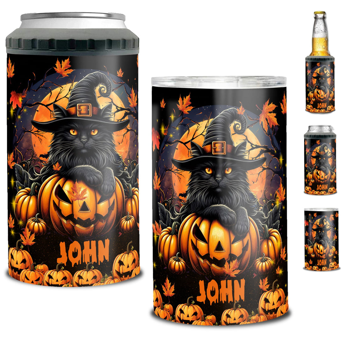 Personalized Cat Halloween Can Cooler 4 in 1 Holder Cup with Lids Customized Name 16oz Beer Drinking Gifts for Cats Lovers Women Men Kids Teen Holiday