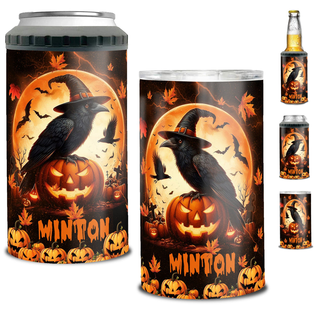 Personalized Halloween Can Cooler 4 in 1 Holder Cup with Lids Customized Name 16oz Beer Drinking Gifts for Raven Crow Lovers Women Men Kids Teen Holiday