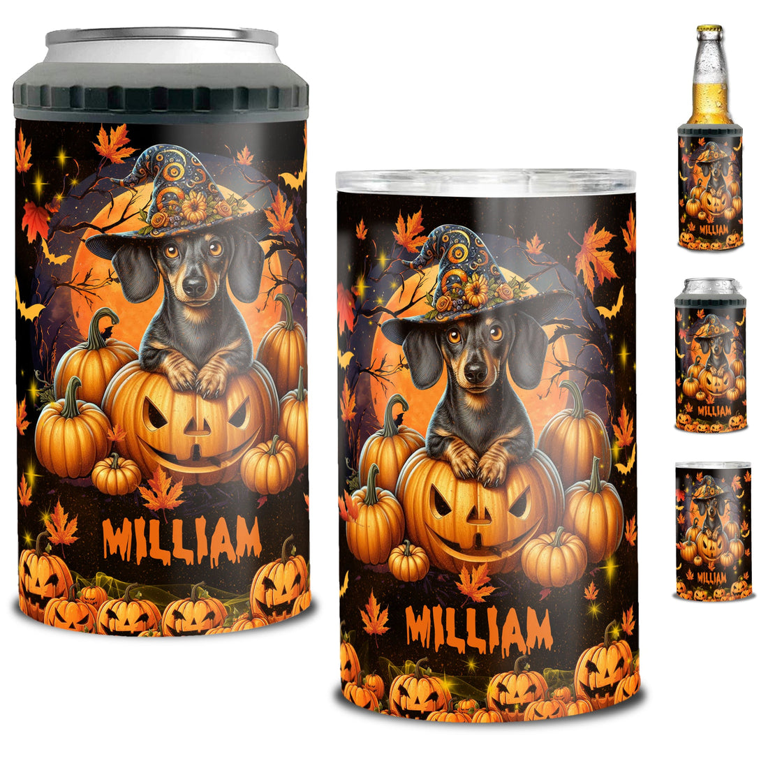 Personalized Dachshund Halloween Can Cooler 4 in 1 Holder Cup with Lids Customized Name 16oz Beer Drinking Gifts for Dog Lovers Women Men Kids Teen Holiday