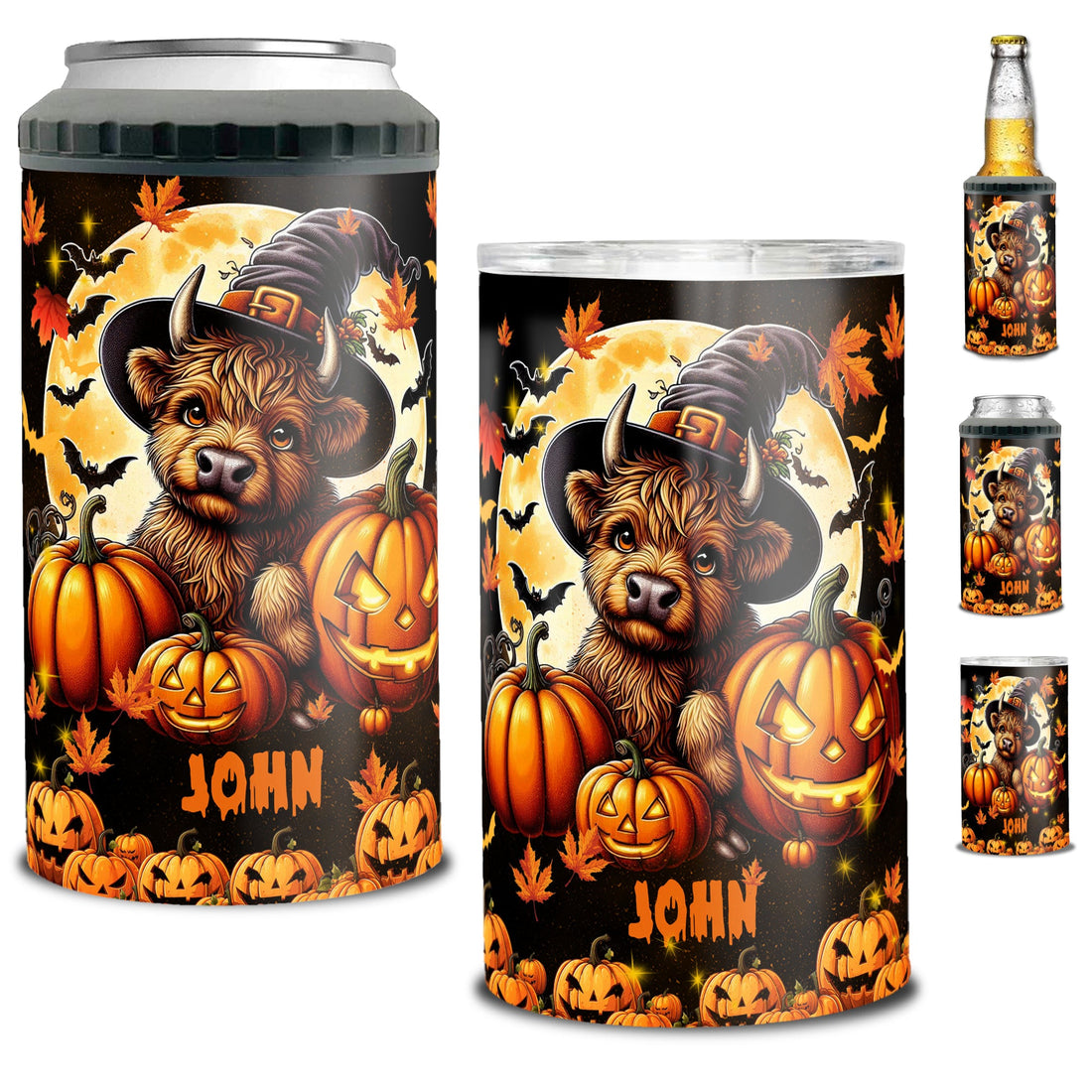 Personalized Highland Cow Halloween Can Cooler 4 in 1 Holder Cup with Lids Customized Name 16oz Beer Drinking Gifts for Women Men Kids Teen Holiday