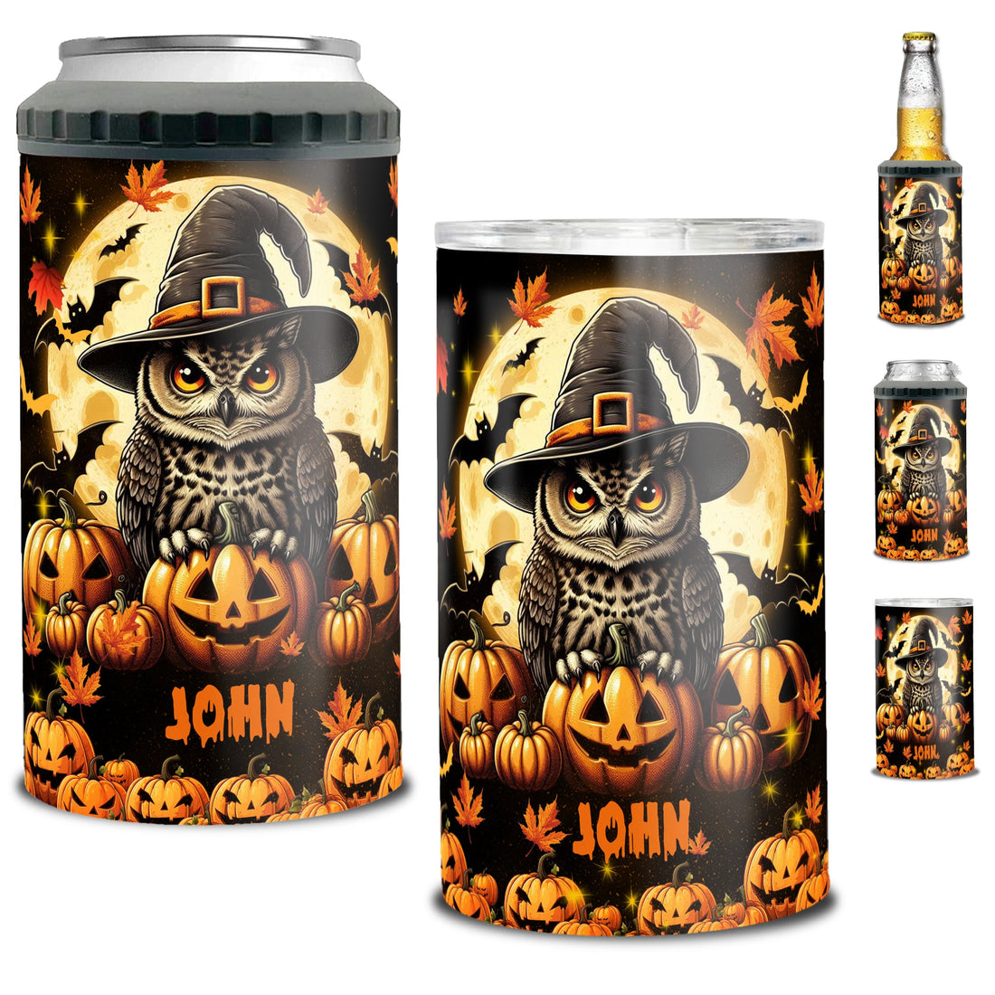Personalized Owl Halloween Can Cooler 4 in 1 Holder Cup with Lids Customized Name 16oz Beer Drinking Gifts for Owls Lovers Women Men Kids Teen Holiday