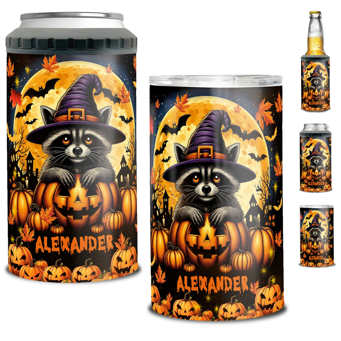 Personalized Raccoon Halloween Can Cooler 4 in 1 Holder Cup with Lids Customized Name 16oz Beer Drinking Gifts for Raccoons Lovers Women Men Kids Teen Holiday