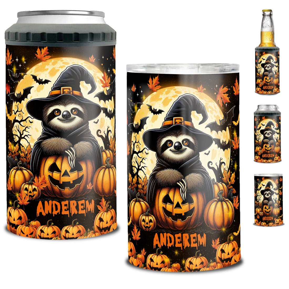 Personalized Sloth Halloween Can Cooler 4 in 1 Holder Cup with Lids Customized Name 16oz Beer Drinking Gifts for Sloths Lovers Women Men Kids Teen Holiday