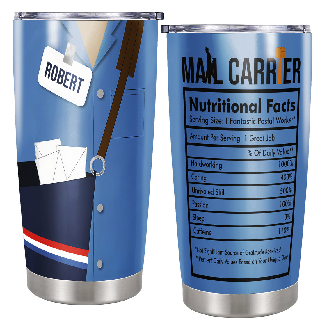 Personalized Mailman Tumbler Customized Name Mail Carrier Nutritional Facts Stainless Steel Insulated Cup with Lid 20 30oz Gift for Postman Postal Worker Delivery Packages