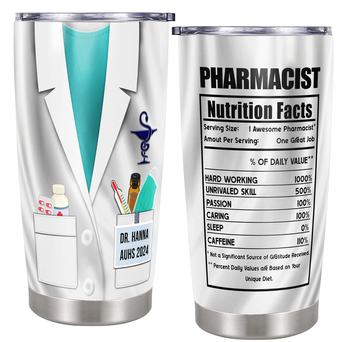 Personalized Pharmacist Tumbler Custom Name Healthcare Worker Nutrition Facts Insulated Travel Coffee Mug with Lid Stainless Steel 20 30 Oz Medical Pharmacology Gift for Coworkers