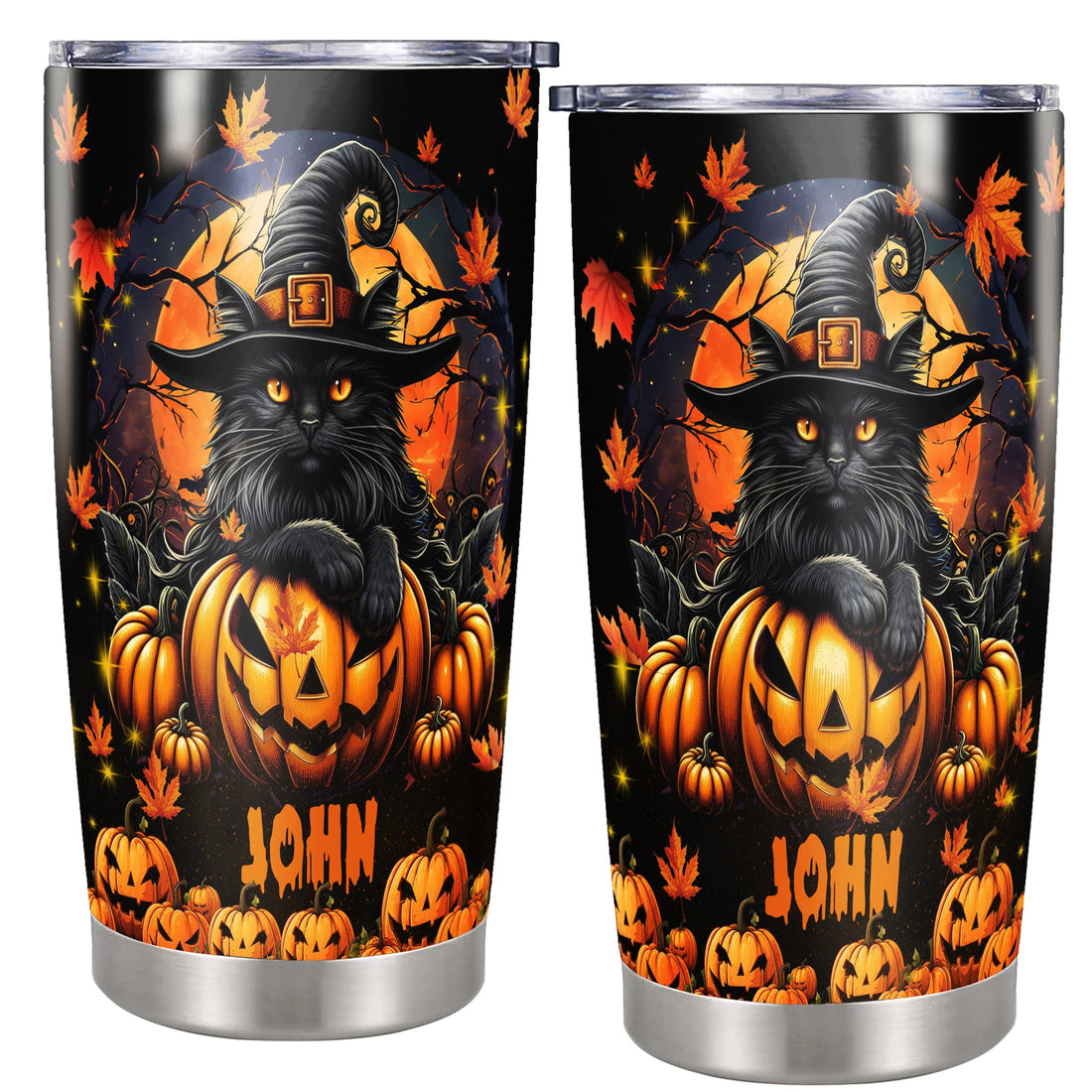 Personalized Halloween Black Cat Tumbler Custom Name Spooky Travel Mug Coffee Insulated Cup with Lid Stainless Steel 20Oz 30Oz Decor Gifts for Women Men Kids