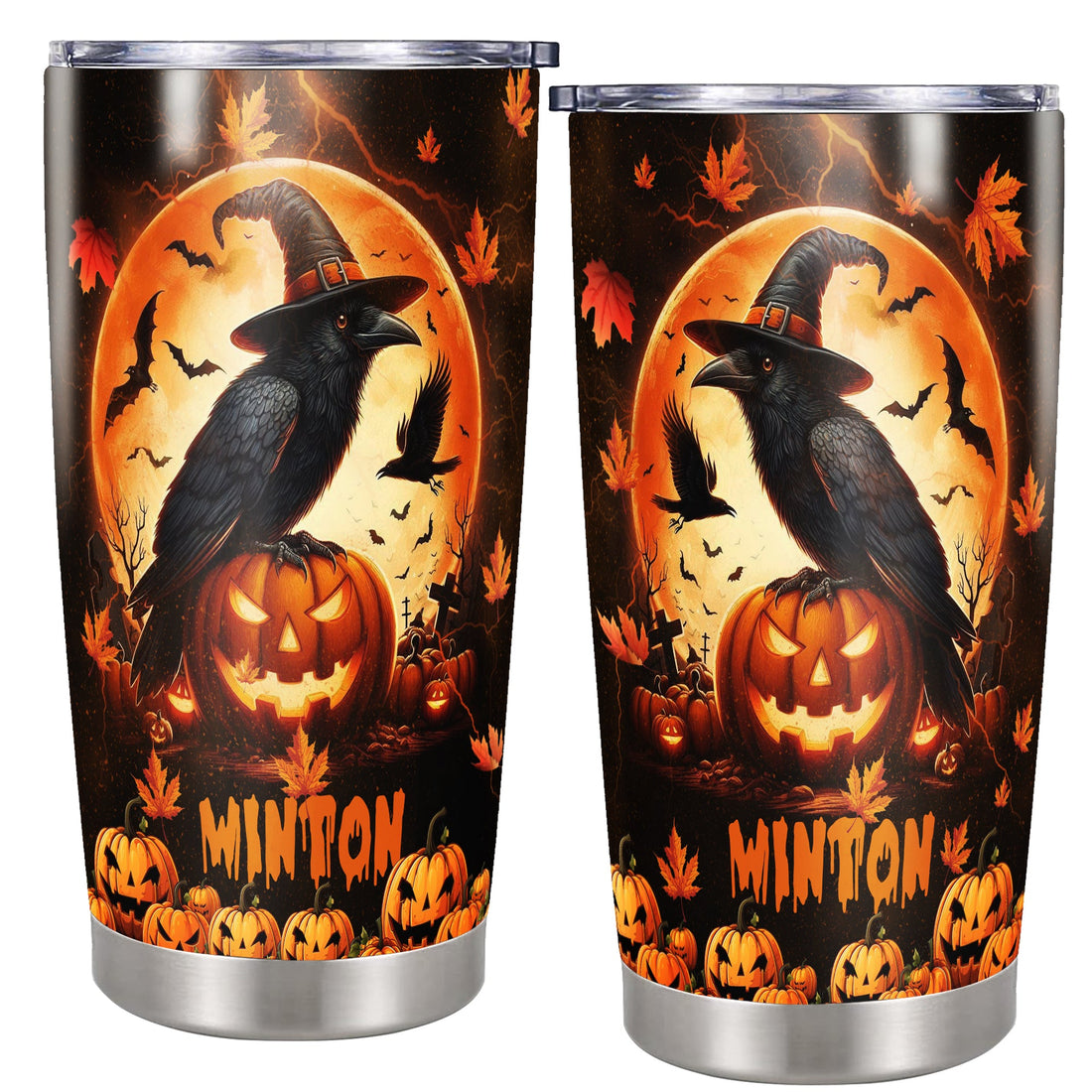 Personalized Halloween Raven Crow Tumbler Custom Name Travel Mug Coffee Insulated Cup with Lid Stainless Steel 20Oz 30Oz Decor Gifts for Women Men Kids