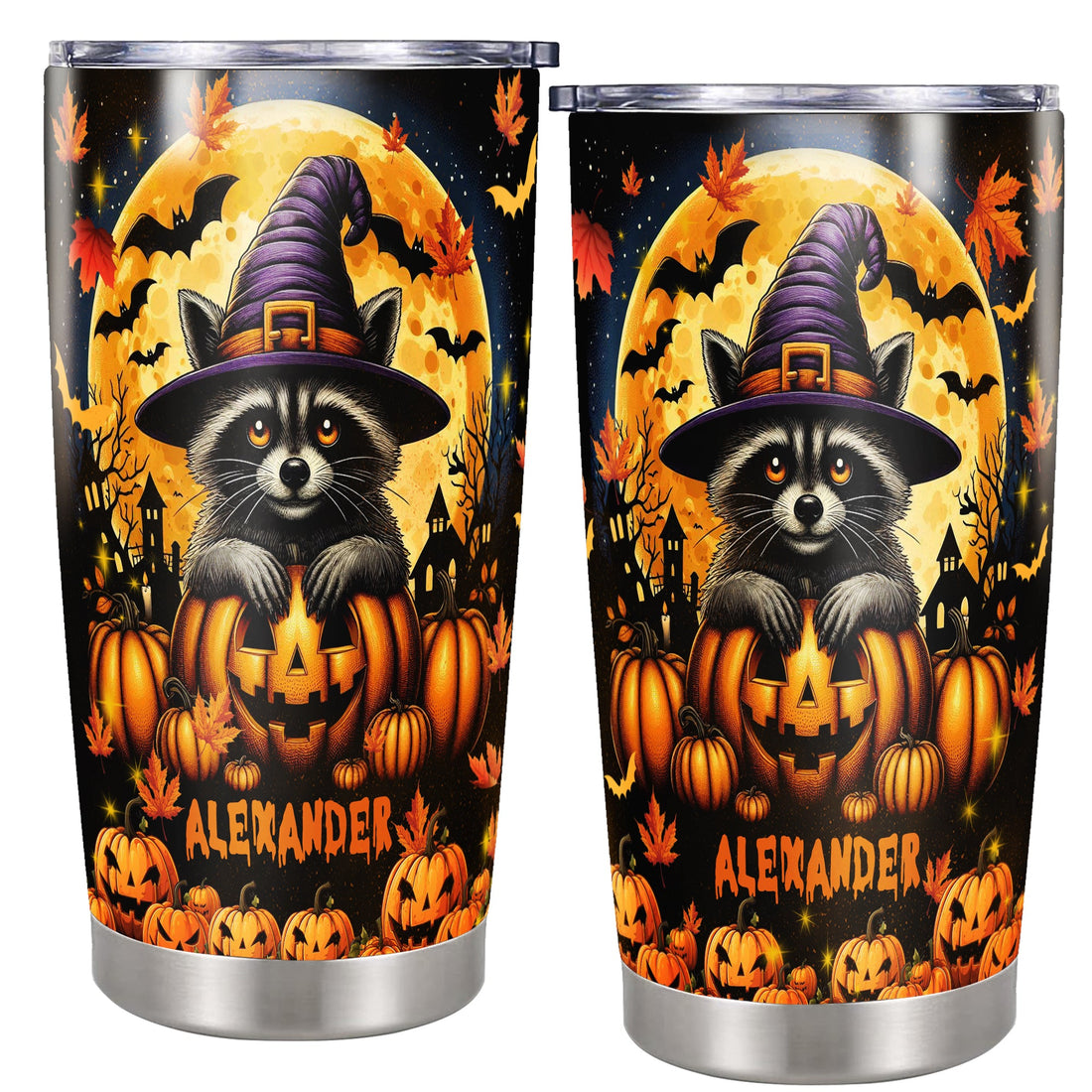 Personalized Halloween Raccoon Tumbler Custom Name Travel Mug Coffee Insulated Cup with Lid Stainless Steel 20Oz 30Oz Decor Gifts for Women Men Kids