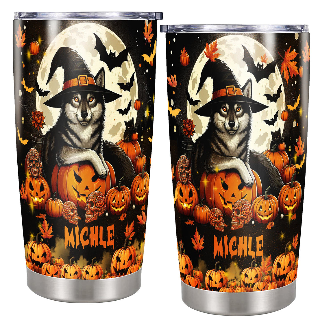 Personalized Wolf Halloween Tumbler Custom Name Travel Mug Coffee Insulated Cup with Lid Stainless Steel 20Oz 30Oz Decor Gifts for Men Women Kids