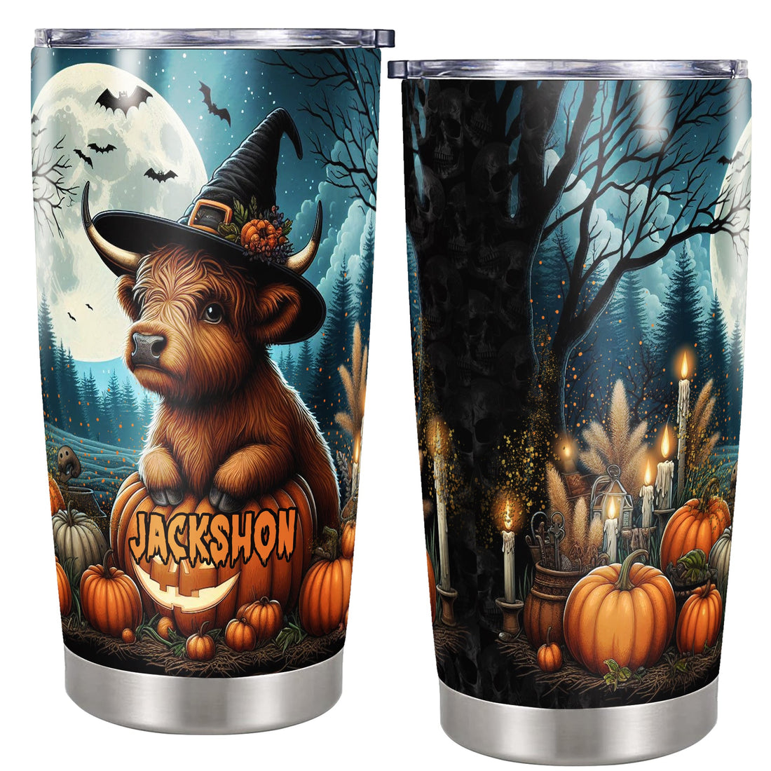 Personalized Highland Cow Halloween Tumbler Custom Name Cows Travel Mug Coffee Insulated Cup with Lid Stainless Steel 20Oz 30Oz Gifts for Women Men Girls Spooky Season
