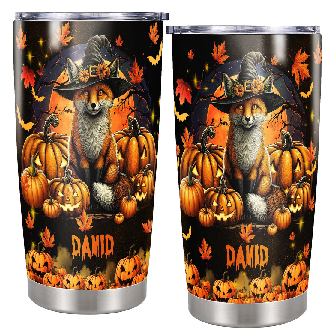 Personalized Halloween Fox Tumbler Custom Name Travel Mug Coffee Insulated Cup with Lid Stainless Steel 20Oz 30Oz Decor Gifts for Women Men Kids