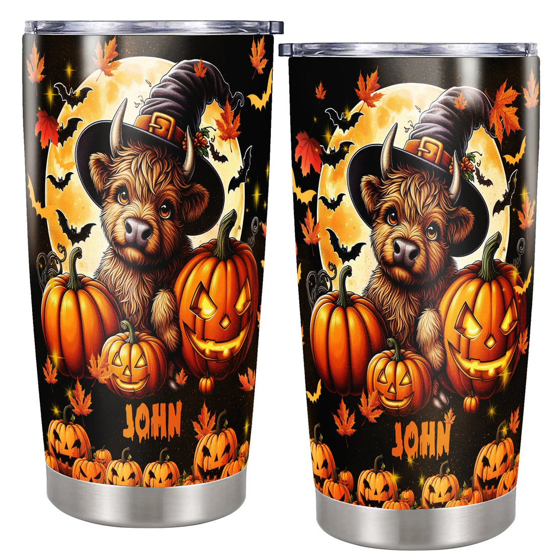 Personalized Halloween Highland Cow Tumbler Custom Name Travel Mug Coffee Insulated Cup with Lid Stainless Steel 20Oz 30Oz Decor Gifts for Women Men Kids